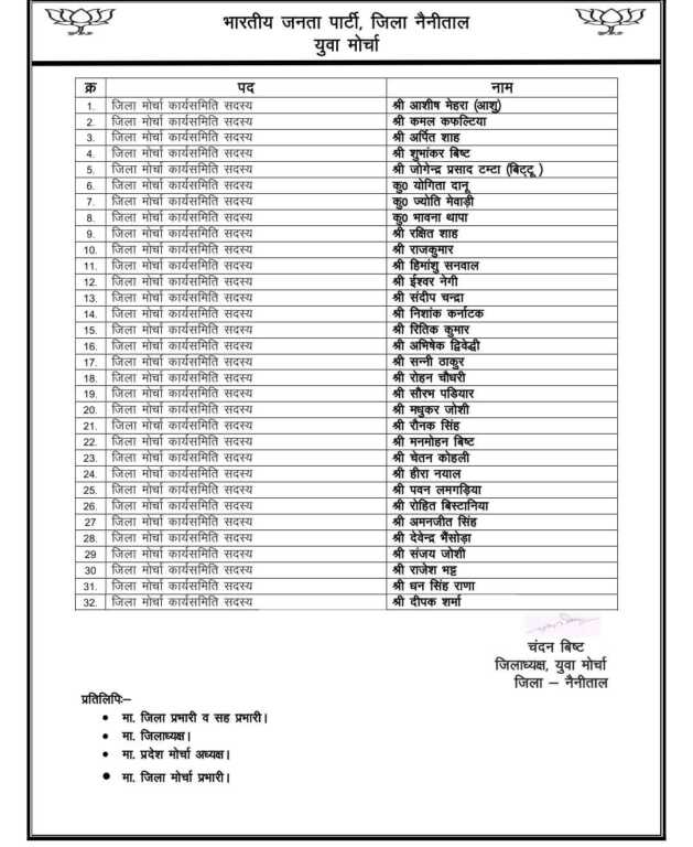 जारी सूची में आशिष मेहरा, कमल कफलटिया, आदित्य शाह, श्यामंकर बिष्ट, योगिता दानू, ज्योति मेवाड़ी, भावना थापा, सचिन शाह, राजकुमार, हिमांशु सनवाल, ईश्वर नेगी, संदीप चंद्रा, निशांक कन्याक, विवेक कुमार, अभिषेक द्विवेदी, सन्नी ठाकुर, सौरभ पडियार, मधुकर जोशी, रोनक सिंह, मनमोहन बिष्ट, चेतन कोहली, हीरा नयाल, पवन लमगड़िया, रोहित बिरसिनिया, अमनजीत सिंह, देवेंद्र भंडारी, संजय जोशी, राजेश भट्ट, धन सिंह राणा और दीपक शर्मा को भी जिला कार्यसमिति में शामिल किया गया है।