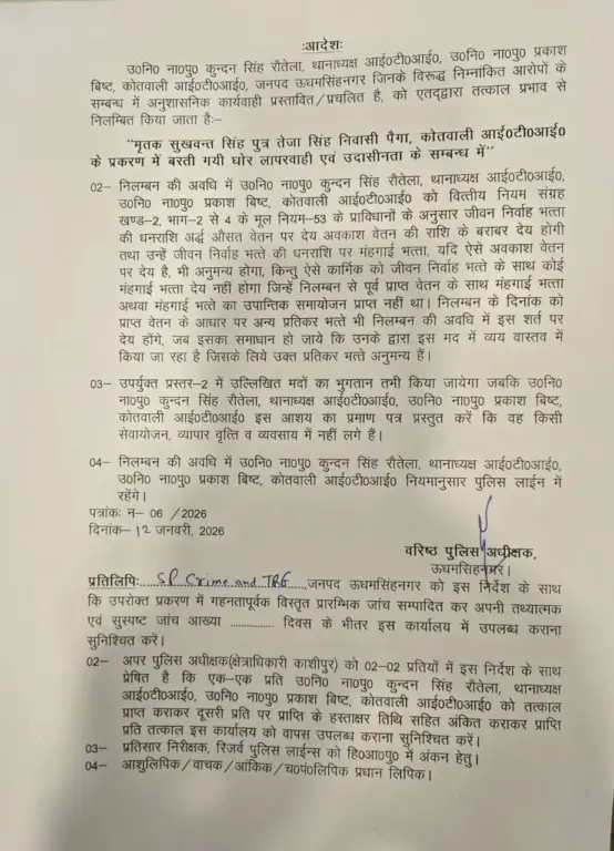 हल्द्वानी। गौलापार के एक होटल में स्वयं को गोली मार कर आत्महत्या करने वाले किसान मृतक सुखवंत सिंह पुत्र तेजा सिंह से जुड़े आत्महत्या प्रकरण में बरती गई गंभीर लापरवाही और उदासीनता को संज्ञान में लेते हुए वरिष्ठ पुलिस अधीक्षक ऊधमसिंहनगर ने बड़ी प्रशासनिक कार्रवाई की है।एसएसपी के आदेश पर उपनिरीक्षक ना०पु० कुन्दन सिंह रौतेला (थानाध्यक्ष, कोतवाली आईटीआई) तथा उपनिरीक्षक ना०पु० प्रकाश बिष्ट (कोतवाली आईटीआई) को तत्काल प्रभाव से निलंबित कर दिया गया है। दोनों अधिकारियों के विरुद्ध अनुशासनिक कार्रवाई प्रस्तावित/प्रचलित है।निलंबन अवधि के दौरान दोनों अधिकारियों को मूल नियम-53 के तहत अर्द्ध औसत वेतन के बराबर जीवन निर्वाह भत्ता देय होगा। साथ ही, उन्हें नियमानुसार पुलिस लाइन्स में रहना अनिवार्य किया गया है। जीवन निर्वाह भत्ता इस शर्त पर देय होगा कि संबंधित अधिकारी यह प्रमाणित करेंगे कि वे किसी भी प्रकार के सेवायोजन, व्यापार या व्यवसाय में संलग्न नहीं हैं।