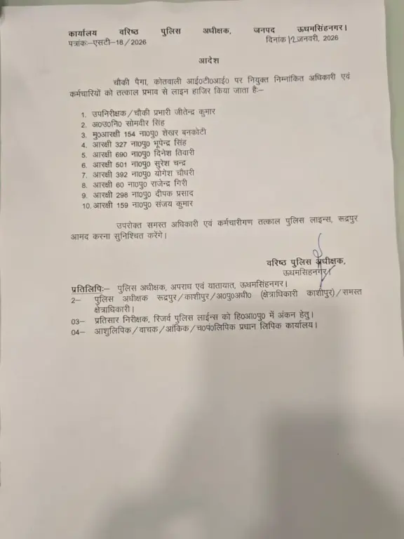वहीं, चौकी पैगा, कोतवाली आईटीआई पर तैनात कुल 10 अधिकारी एवं कर्मचारियों को तत्काल प्रभाव से लाइन हाजिर कर दिया गया है। सभी को पुलिस लाइन्स, रुद्रपुर में तत्काल आमद करने के निर्देश दिए गए हैं।लाइन हाजिर किए गए पुलिसकर्मी:उपनिरीक्षक/चौकी प्रभारी – जितेन्द्र कुमारअ०उ०नि० – सोमवीर सिंहमु०आरक्षी 154 ना०पु० – शेखर बनकोटीआरक्षी 327 ना०पु० – भूपेन्द्र सिंहआरक्षी 690 ना०पु० – दिनेश तिवारीआरक्षी 501 ना०पु० – सुरेश चन्द्रआरक्षी 392 ना०पु० – योगेश चौधरीआरक्षी 60 ना०पु० – राजेन्द्र गिरीआरक्षी 298 ना०पु० – दीपक प्रसादआरक्षी 159 ना०पु० – संजय कुमारएसएसपी ऊधमसिंहनगर ने स्पष्ट शब्दों में कहा है कि लापरवाही किसी भी स्तर पर बर्दाश्त नहीं की जाएगी और जांच में दोषी पाए जाने वाले अधिकारियों एवं कर्मचारियों के विरुद्ध कठोर कार्रवाई की जाएगी।
