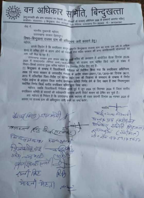 ज्ञापन में यह भी उल्लेख किया गया कि दिनांक 25 सितम्बर 2025 को मुख्य सचिव की अध्यक्षता में हुई शासनस्तरीय बैठक में यह स्पष्ट किया गया था कि “बिंदुखत्ता प्रकरण में जिला स्तरीय वनाधिकार समिति निर्णय लेने के लिए सक्षम है तथा नियमानुसार आवश्यक कार्यवाही हेतु निर्णय ले”, परंतु इसके बावजूद अधिसूचना अब तक जारी नहीं हो पाई है।